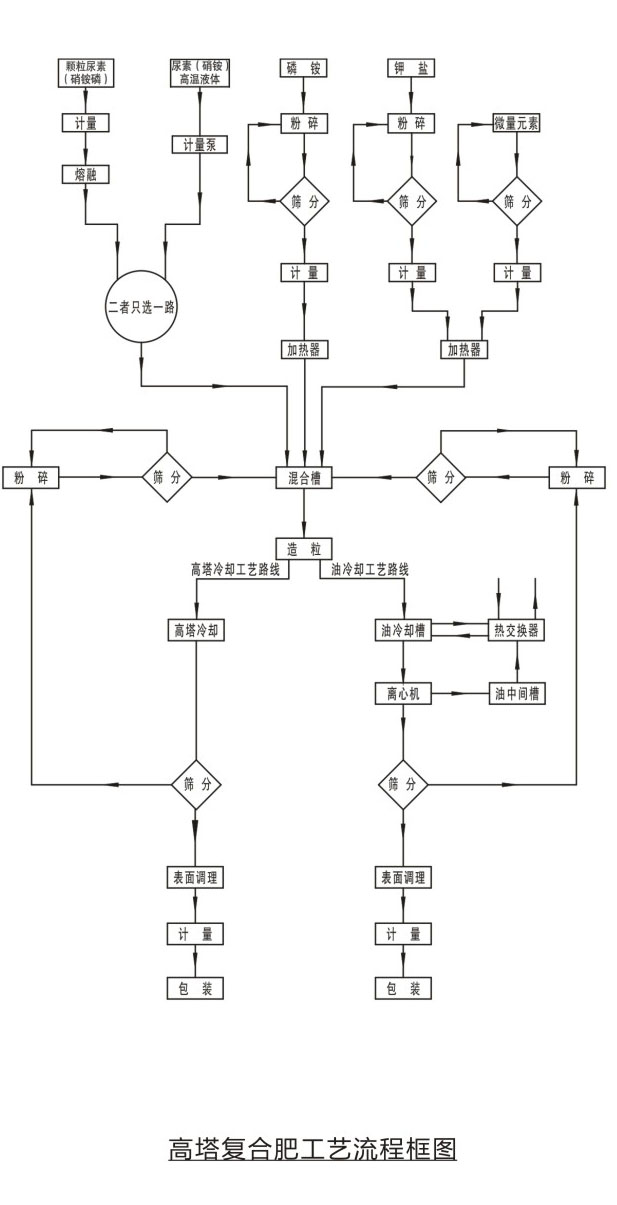工藝原理固體尿素或硝銨(硝銨磷等)通過(guò)熔融器加熱熔融后成為熔融液,也可以直接使用蒸發(fā)濃縮后的液態(tài)尿液(硝銨)液中加入相應(yīng)的磷肥、鉀肥、填料及添加劑制成 混合料漿?;旌狭蠞{進(jìn)入高塔造粒設(shè)備進(jìn)行噴灑造粒,物料在從高塔下降過(guò)程中,與塔底上升氣流阻力相互作用,與其進(jìn)行熱交換后降落到塔底,落入塔底的物料,經(jīng)篩分表面處理后得到顆粒復(fù)合肥。